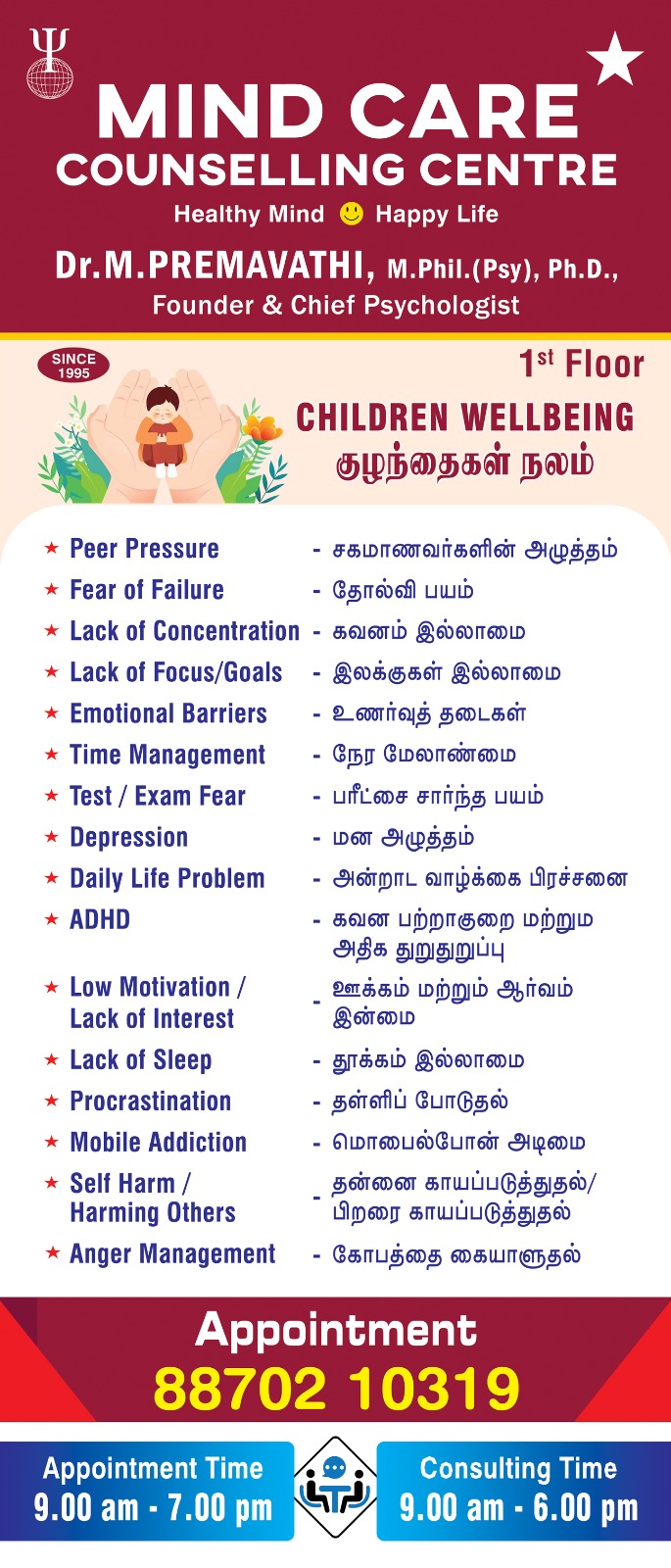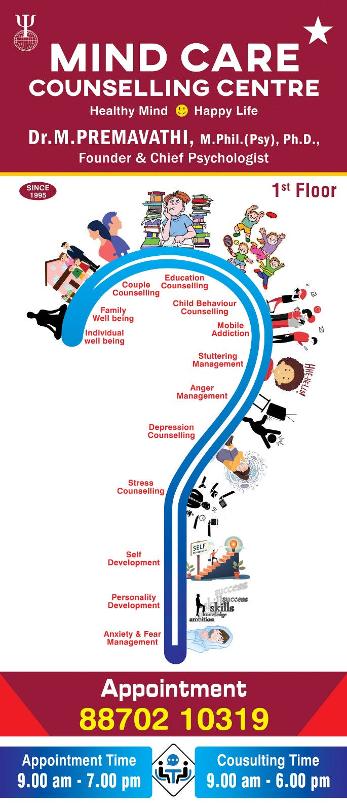 Found in 2010, MIND CARE COUNSELLING CENTRE is located in the heart of Coimbatore city and extends its services globally through both ONLINE and IN PERSON. Mind Care Counselling Centre is one of the pioneers in offering sophisticated services which includes rapport establishment, psychodiagnosis/psychological testing, goal setting, customized worksheets, Counselling, therapies and follow up with flexibility.